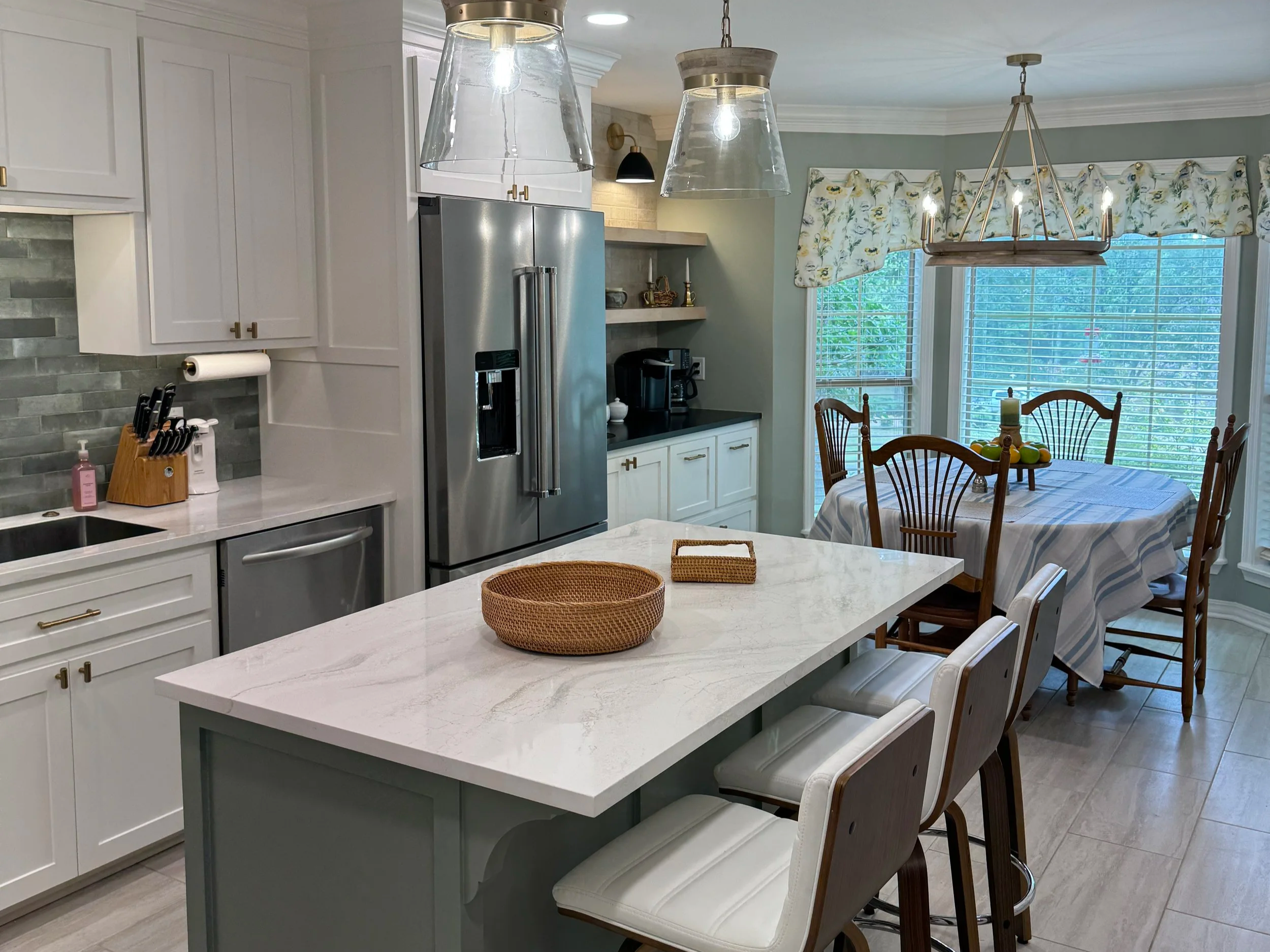 Answer: Kitchen Remodels with new custom cabinetry and functional storage will increase the quality and overall enjoyment of your home. We at Hendricks Remodeling recommend all drawers on the base cabinets and durable countertops such as Cambria Quartz. We also recommend adequate lighting such as LED Can Lights on the ceiling as well as under-cabinet lighting to keep from having a “shadow look” on your new countertops. It is important to maintain plenty of working space in your kitchen while improving your kitchen’s overall function and aesthetic.