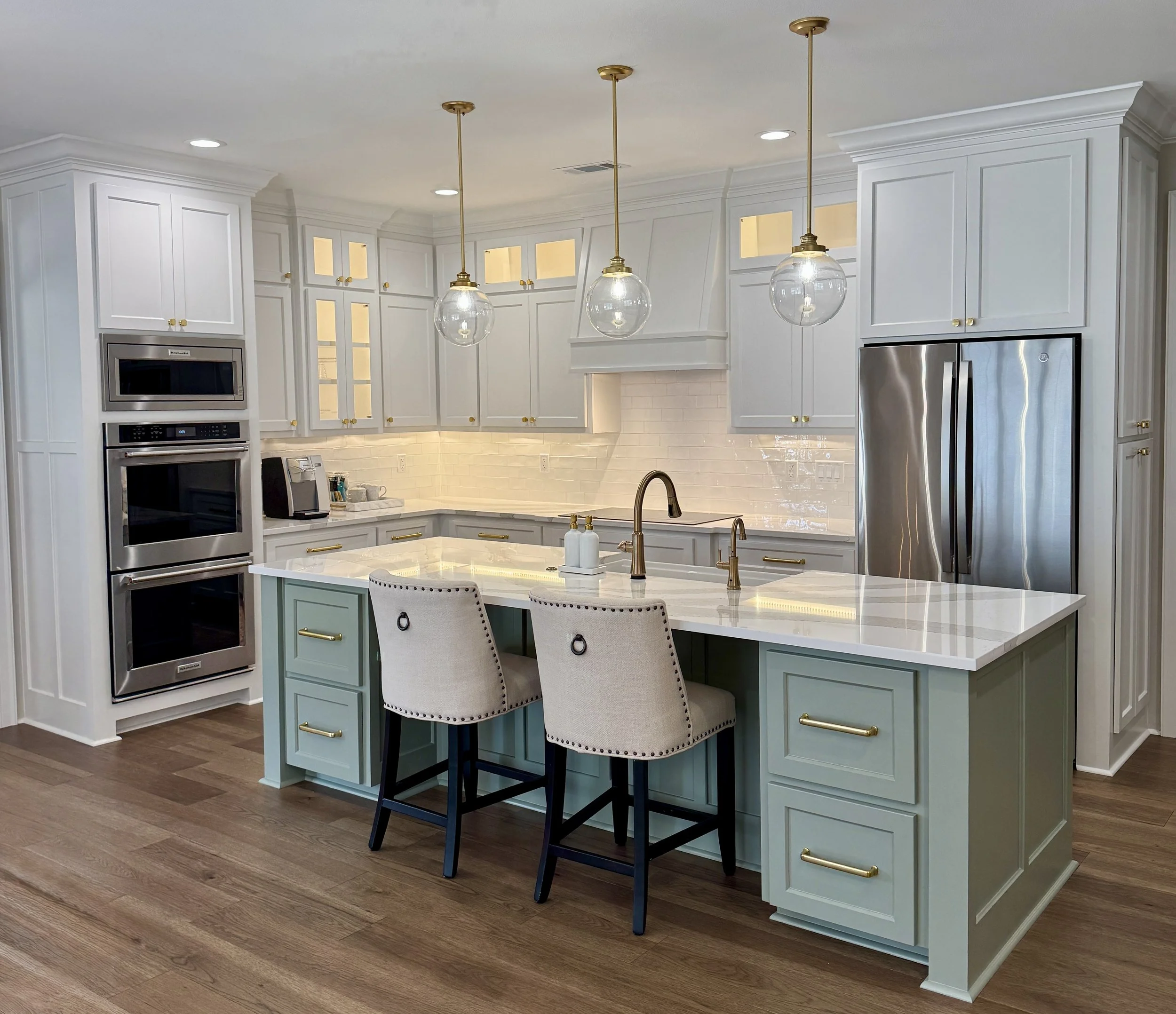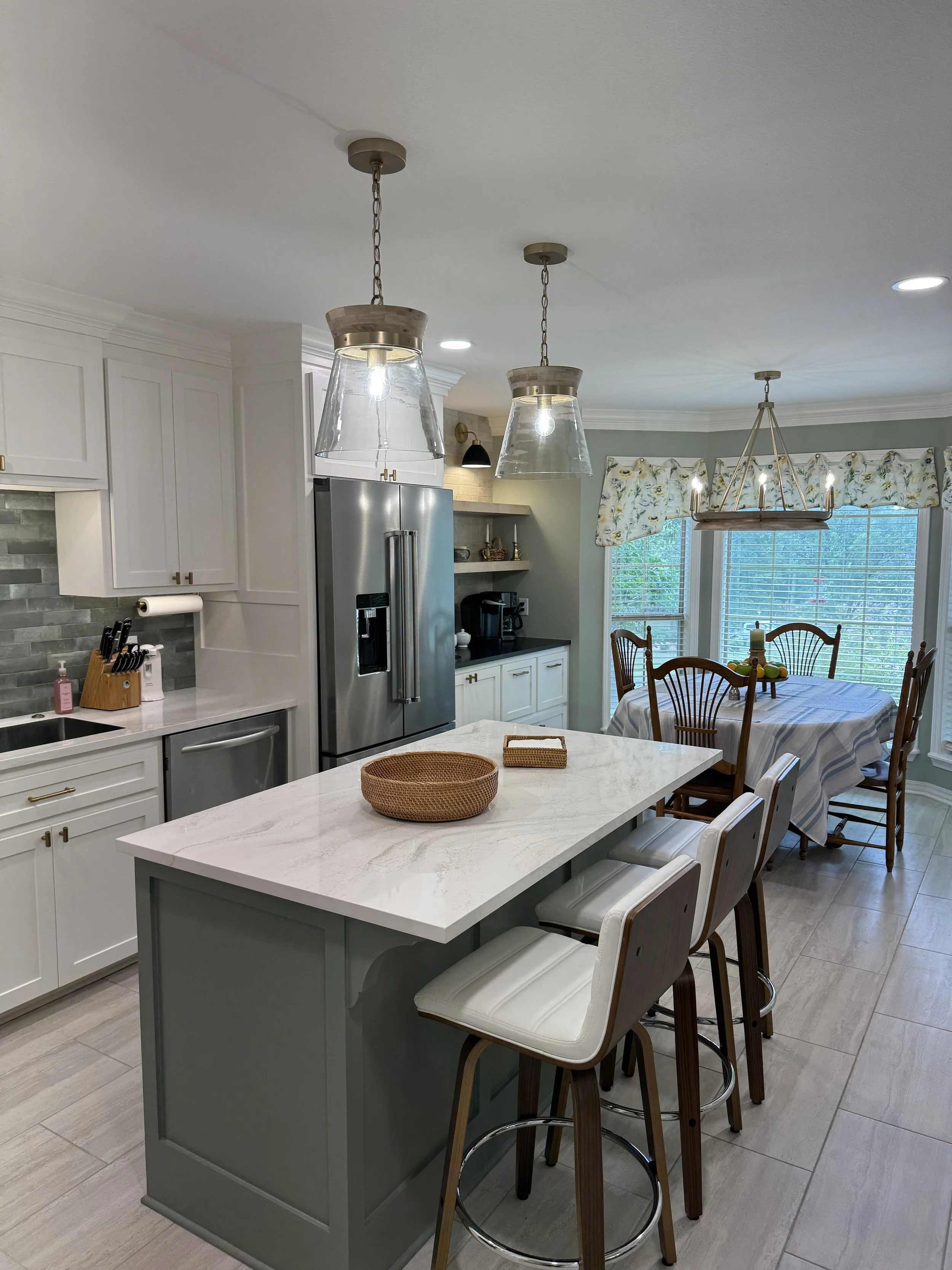 Answer: Kitchen Remodels with new custom cabinetry and functional storage will increase the quality and overall enjoyment of your home. We at Hendricks Remodeling recommend all drawers on the base cabinets and durable countertops such as Cambria Quartz. We also recommend adequate lighting such as LED Can Lights on the ceiling as well as under-cabinet lighting to keep from having a “shadow look” on your new countertops. It is important to maintain plenty of working space in your kitchen while improving your kitchen’s overall function and aesthetic.